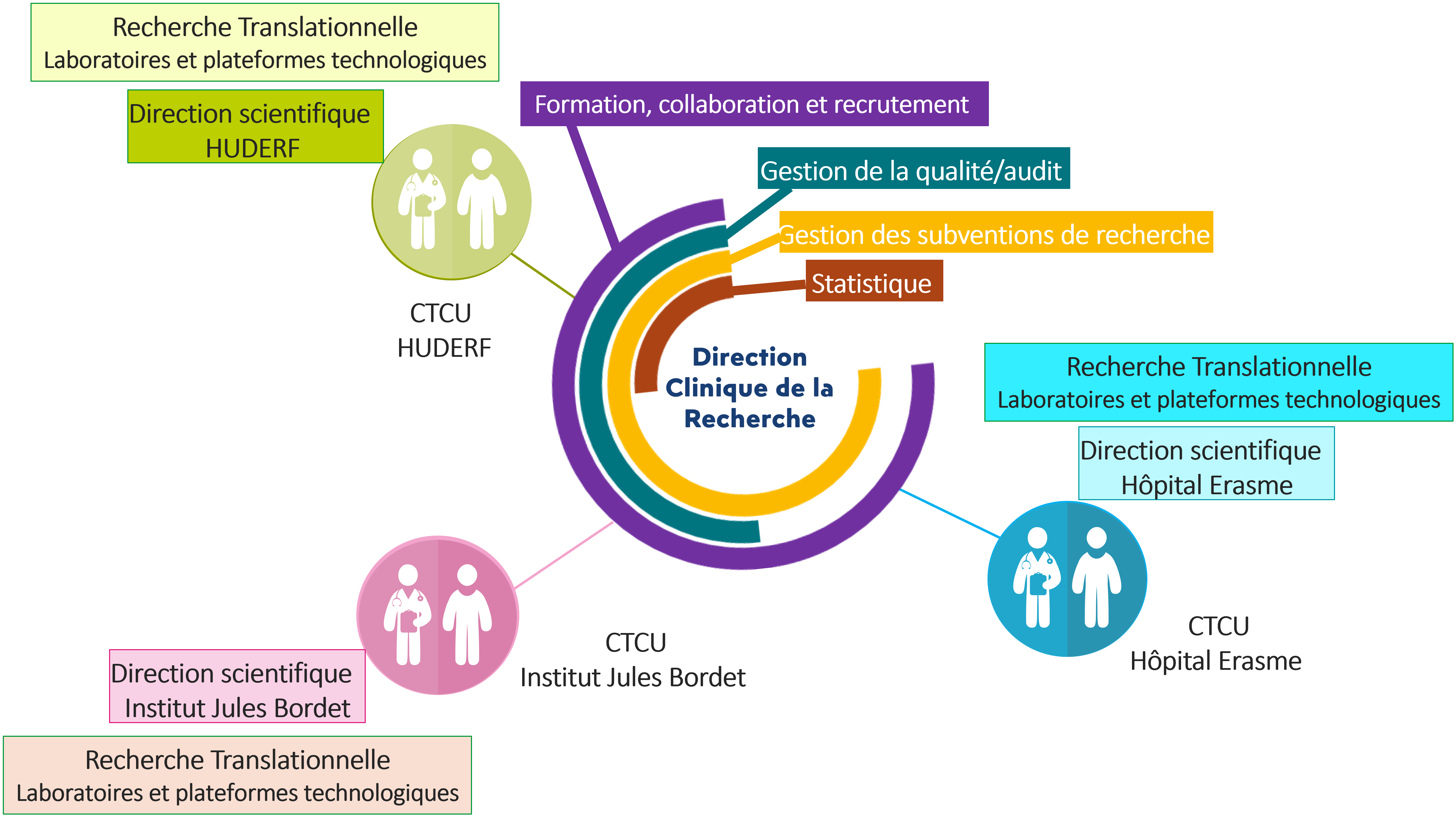 L’H.U.B a mis en place une gouvernance claire et efficace, organisée autour d’une direction tripartite en collaboration étroite avec le comité d’éthique et notre partenaire universitaire, l’ULB. Cette organisation pragmatique garantit une synergie optimale entre la recherche clinique, académique et administrative.